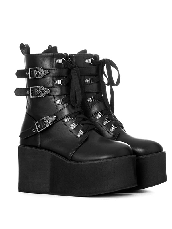 Platformzool met een hoogte van 10 cm (3,94″). Drie verstelbare bandjes met kathedraalgespen en metalen oogjes. Antieke zilveren kathedraalgespen. Vetersluiting aan de voorkant met metalen klinknagellussen. Rits aan de zijkant. Antislipzool. Handige hiellus om gemakkelijk aan te trekken. Lichtgewicht EVA-platformzool Gevoerde binnenzolen.