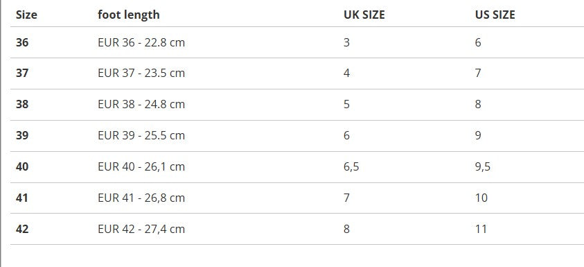 LET OP: Deze schoenen vallen ongeveer een halve maat kleiner dan normaal. Heeft u brede voeten of zit u tussen twee maten in, dan raden wij u aan de grotere maat te kiezen.