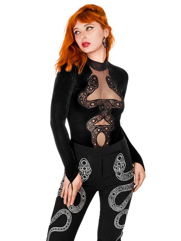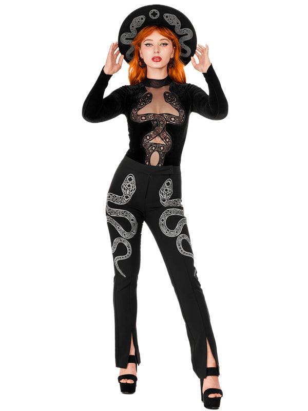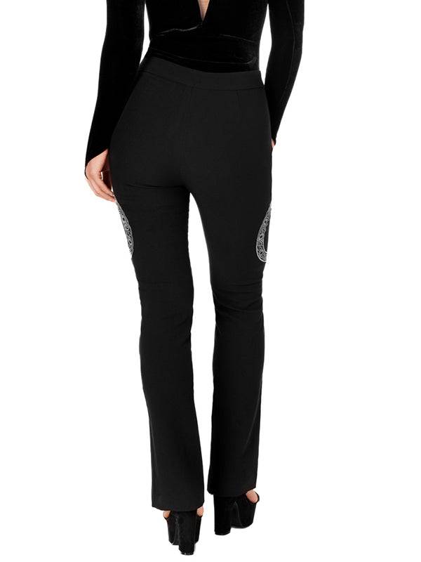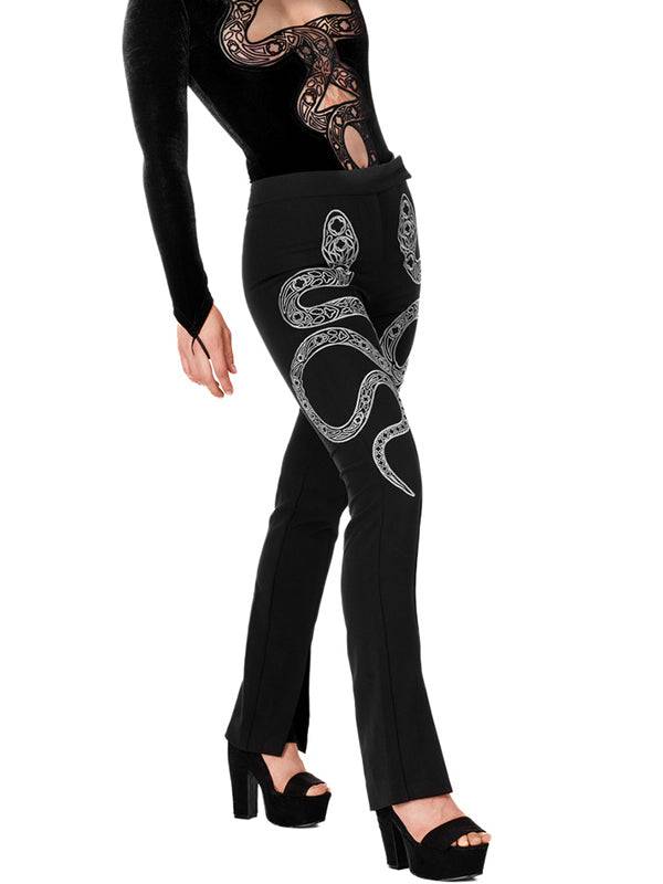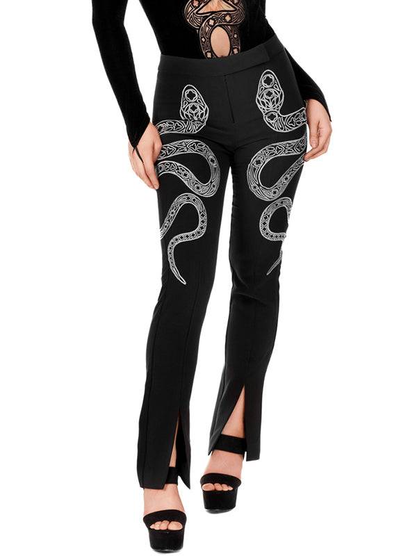 Pants adorned with intricate embroidery depicting a snake filled with delicate cathedral motifs. These gothic-inspired pants in a slim fit wonderfully complement the silhouette and visually elongate the legs. The characteristic flared shape of the pant legs is finished with slits. At the front, the pants feature a concealed button and a zipper, ensuring convenient and secure fastening.