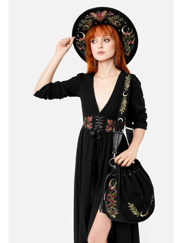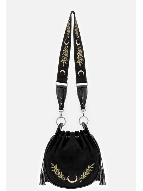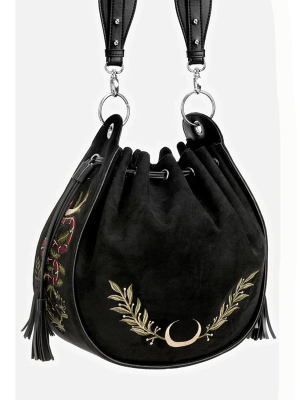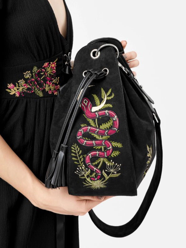 Tas met gedetailleerde bladeren- en maanborduursels op de voorkant en slangen- en bladerenborduursels aan beide zijkanten.