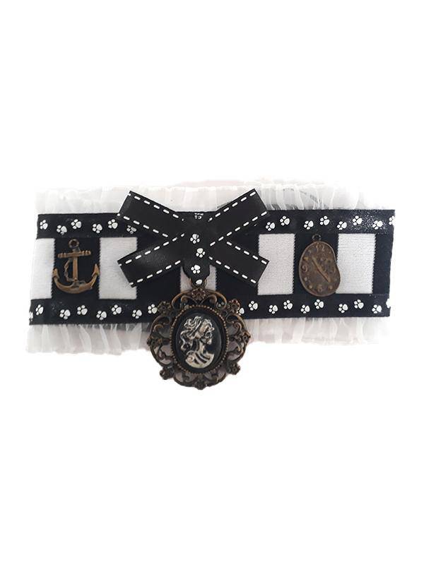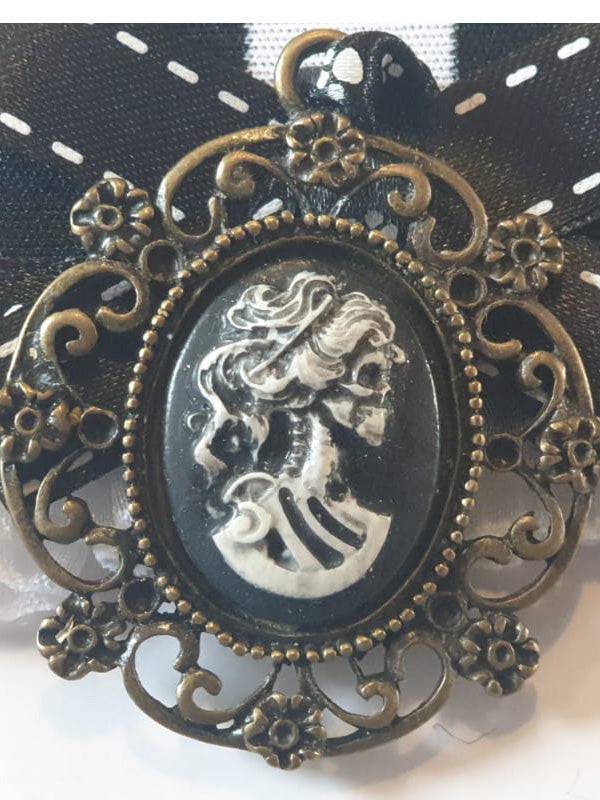 Choker in zwart / wit gestreepte stof en wit kant met camee. Handgemaakt