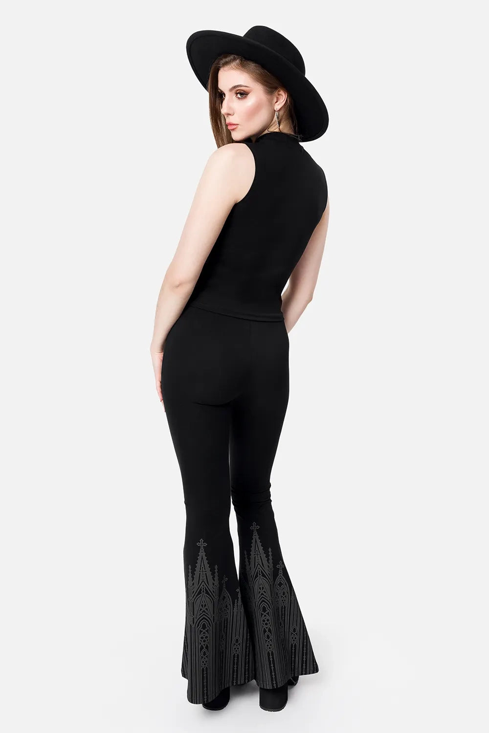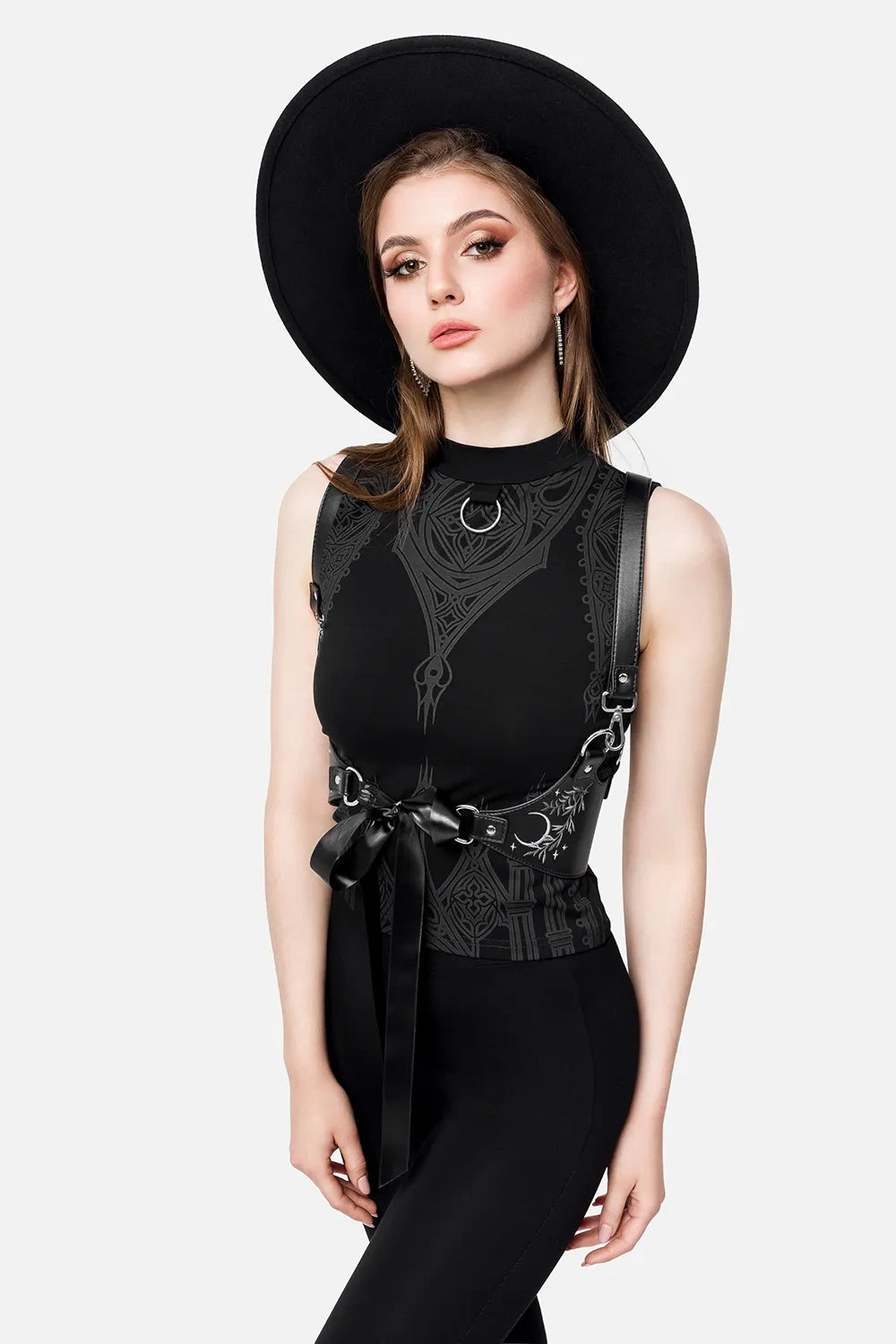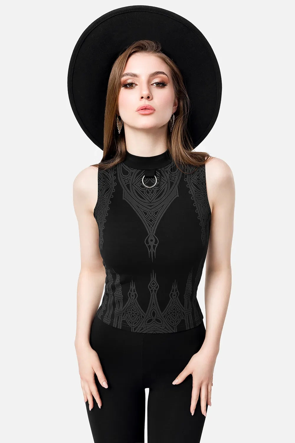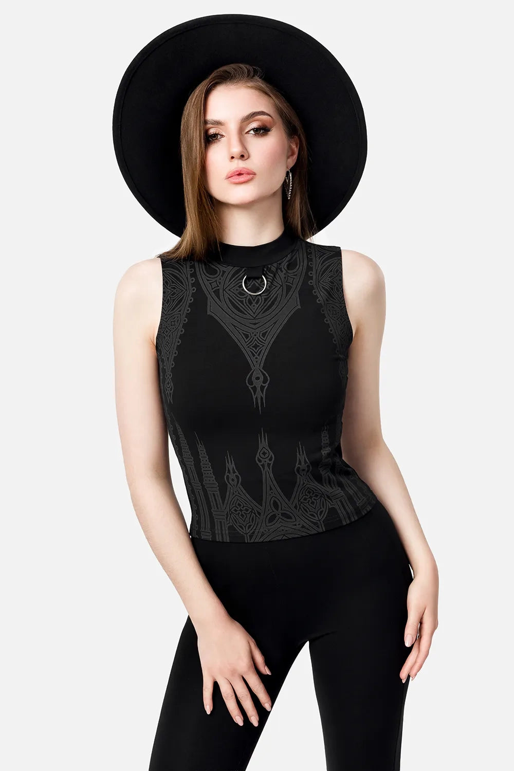 Own your style with this gothic high-neck vest top. Its subtle cathedral-inspired motif appears like shadowed architecture  mysterious and romantic.