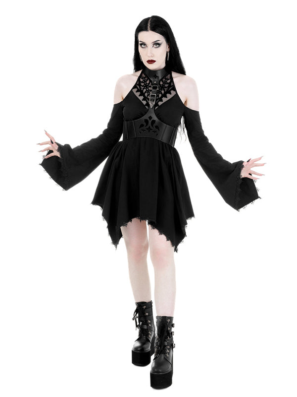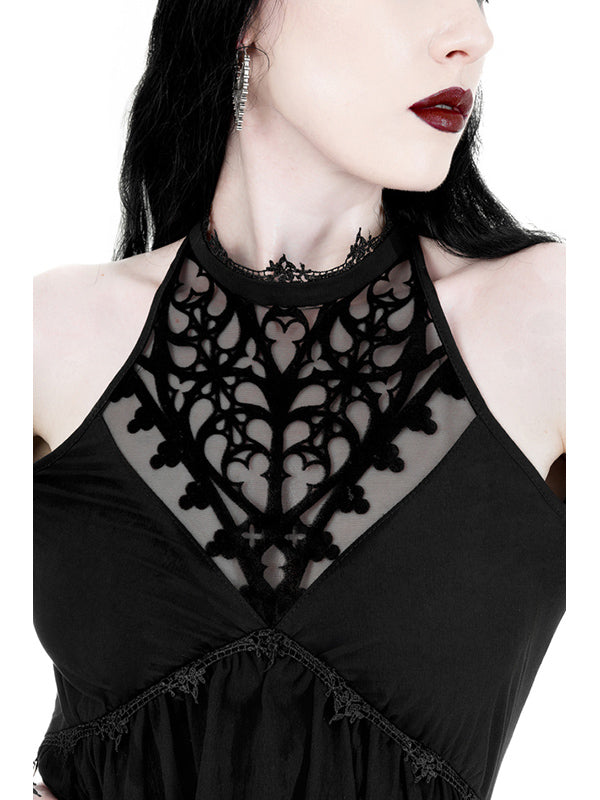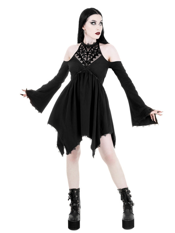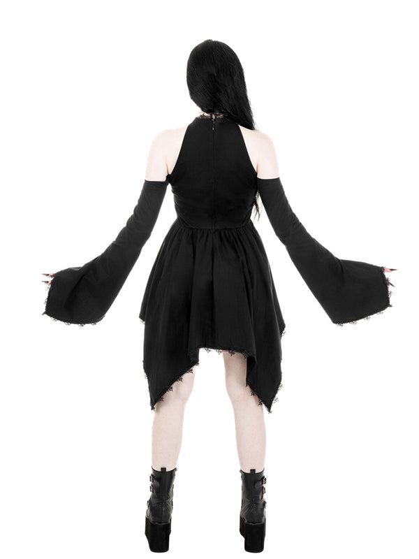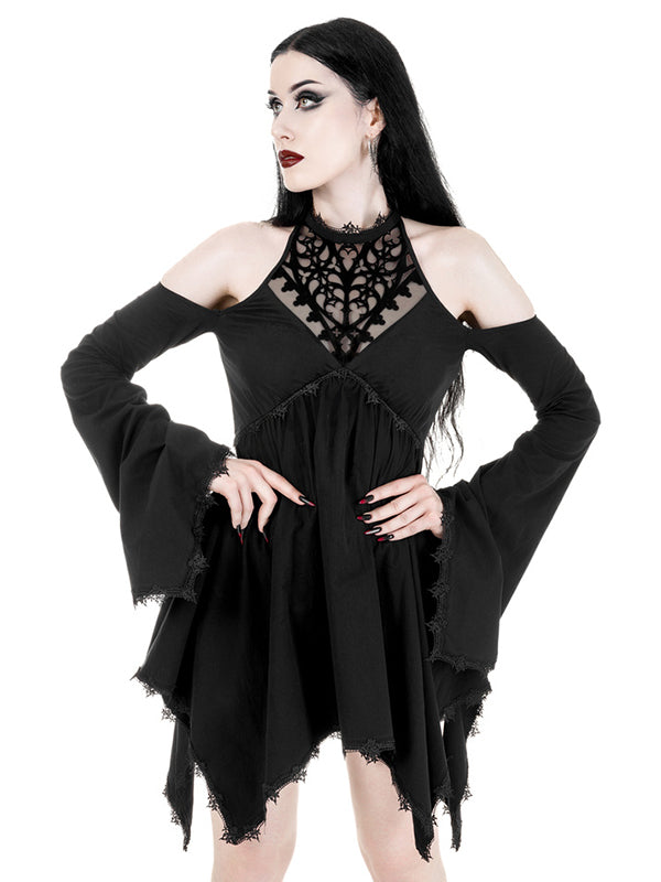 Gothic, elegante heksenjurk. Doorschijnend mesh-paneel op de borst met flockprint. Gedetailleerde kanten rand, die doet denken aan kathedraaltorens, aan de kraag, taille, mouwen en zoom. Asymmetrische zoom. Lange, uitlopende mouwen. Elegante schouderuitsnijdingen en halternekraag. Geplooide taille aan de voorkant met een comfortabele elastische taille aan de achterkant. Verborgen ritssluiting middenachter. Knoop- en lussluiting achter in de nek. Stof op katoenbasis met zachte stretch. Geweven stretch (97% katoen, 3% elastaan).
