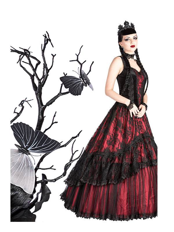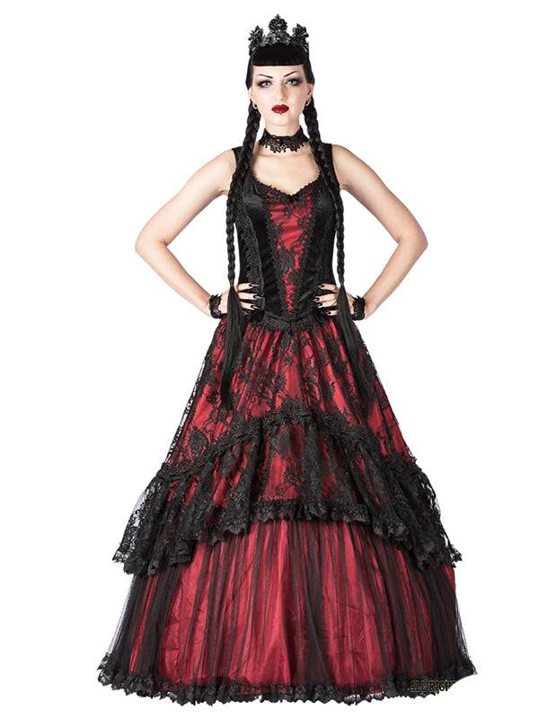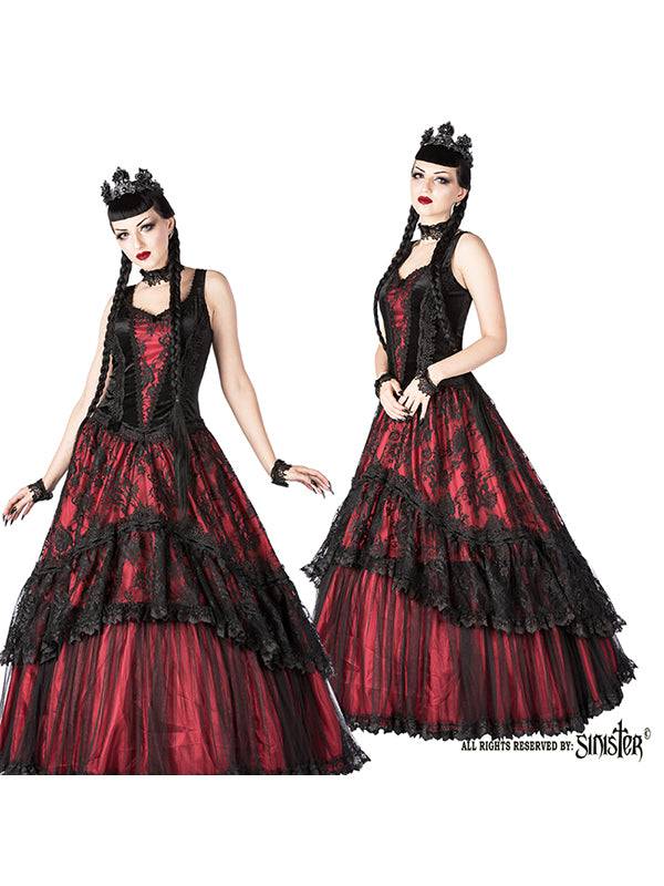 Sinister Temptation Long Red Gothic Dress in Velvet and Satin with Mesh and Lace Details - S ist auf Lager und wird versandt, sobald es wieder verfügbar ist