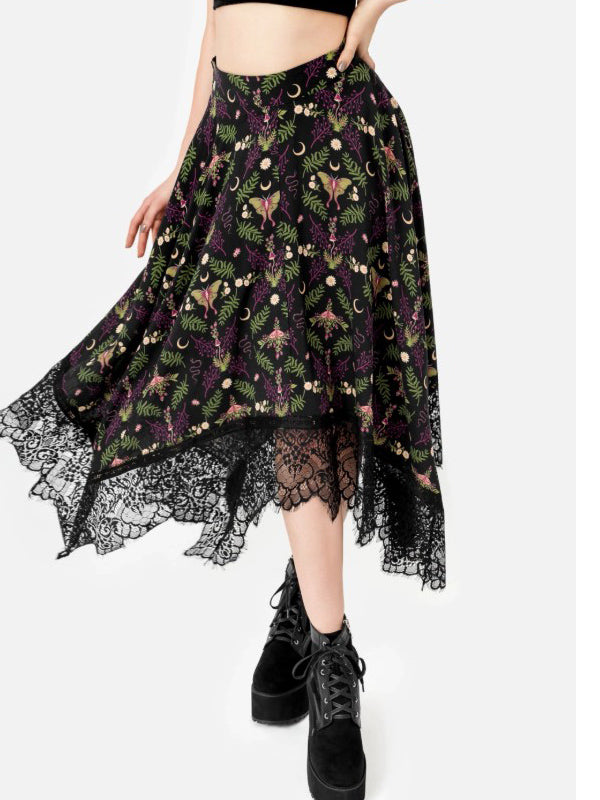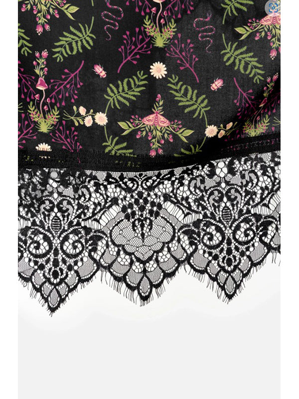 Rok met hoge taille en Wilderwood all-over print met flora en fauna uit het bos. Prachtige brede, gekartelde kanten rand, zorgvuldig vervaardigd om de puntige vorm van de zoom te volgen. Verborgen rits aan de zijkant. Zachte, luchtige viscosestof.