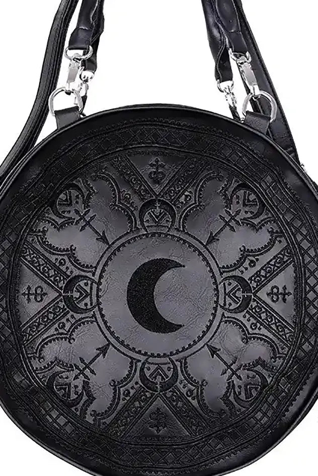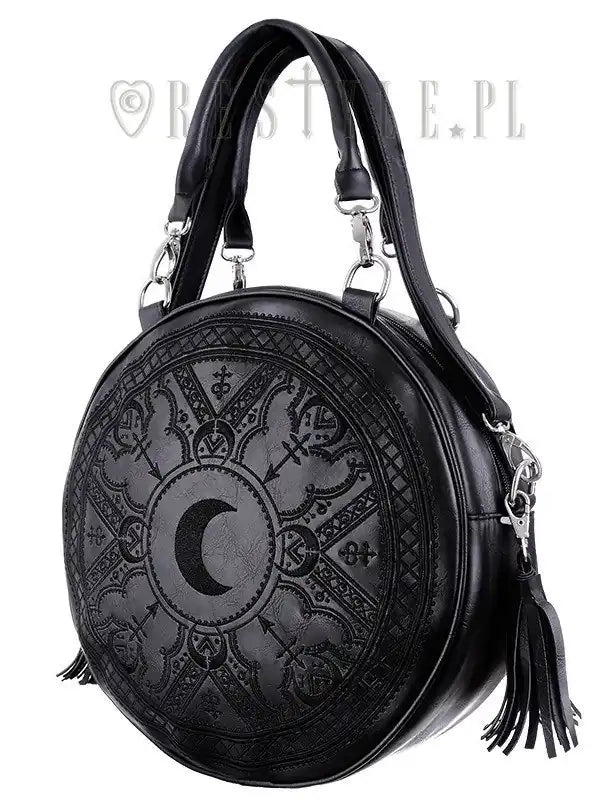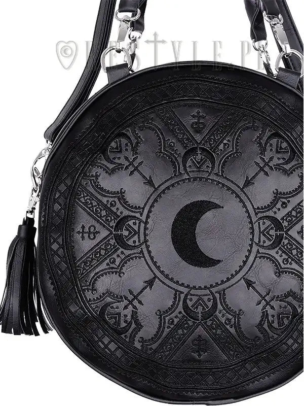 Moon embroidery handbag, witchy purse with moon & tessels "HENNA BLACK ROUND BAG"
