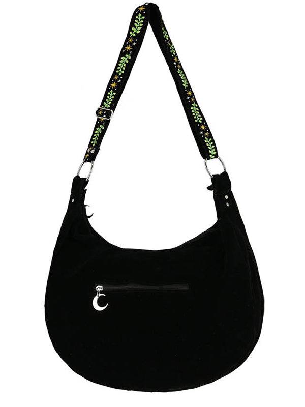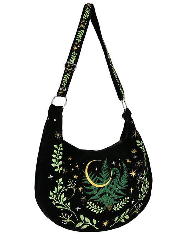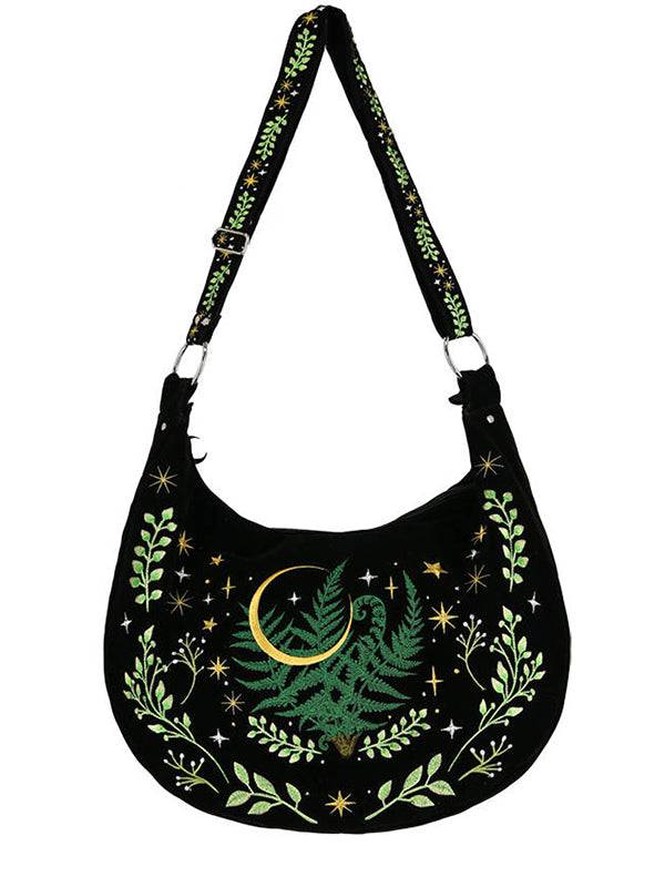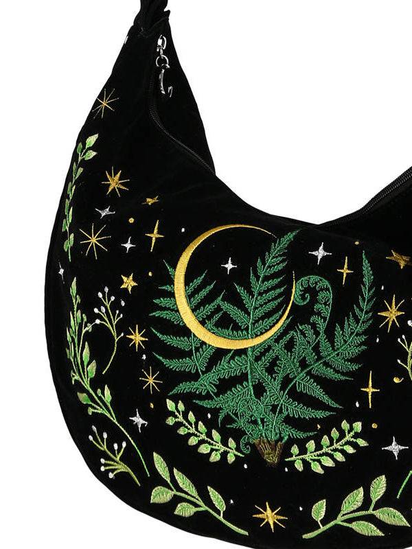 Gothic Velvet Handbag With Embroidery of Fern Leaves, Stars And Golden Moon - Stylish And Spacious