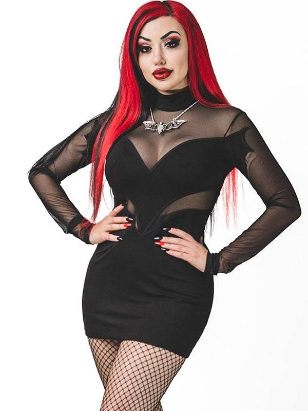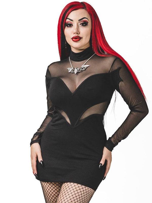 Batty Gothic Dress With Bat Wings & Mesh Sleeves - High Neck, 95% Cotton Blend - S - Op voorraad ist auf Lager und wird versandt, sobald es wieder verfügbar ist