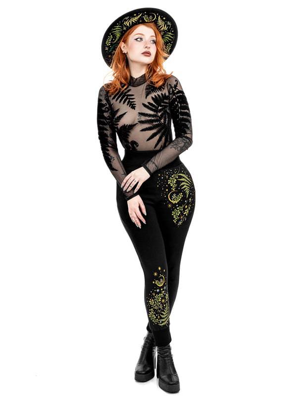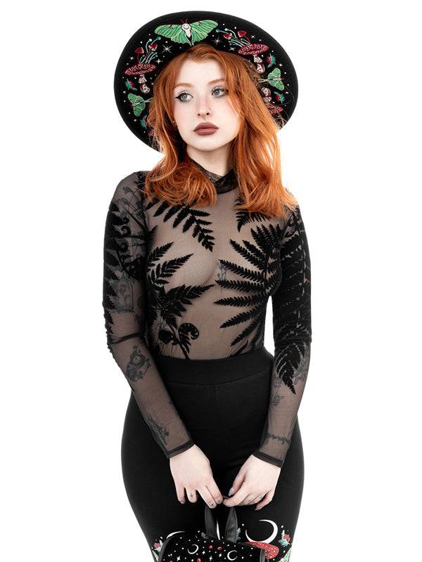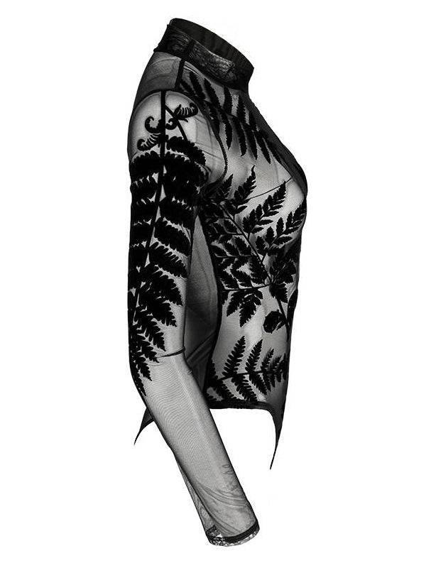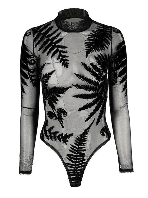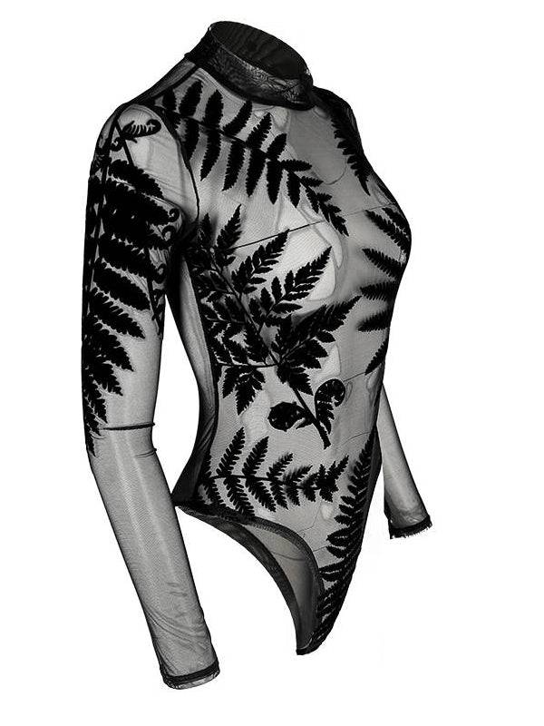 Mesh Bodysuit with Long Sleeves - Forest Witch Luxurious Velvet Print by Restyle - S ist auf Lager und wird versandt, sobald es wieder verfügbar ist