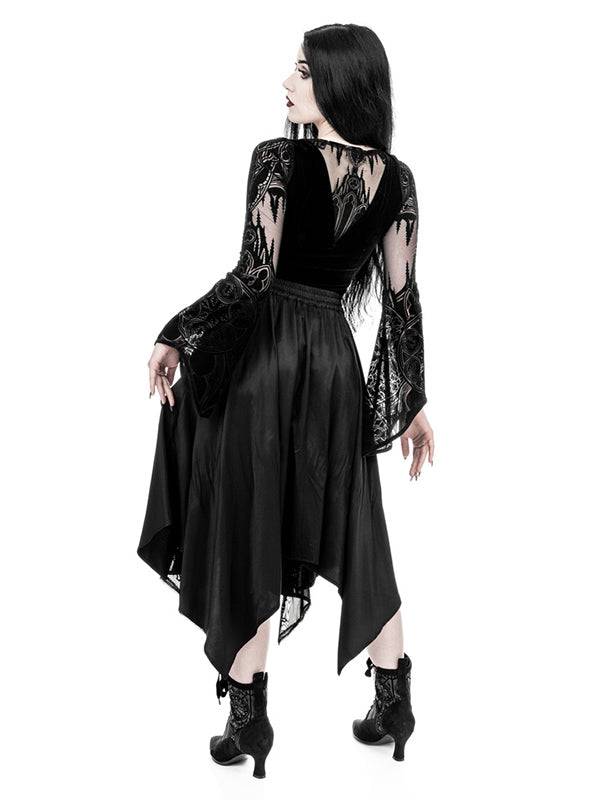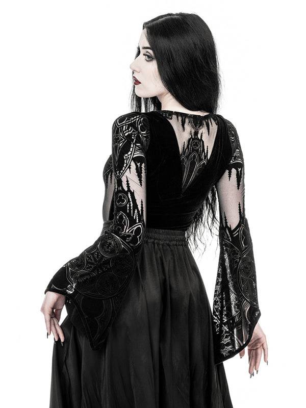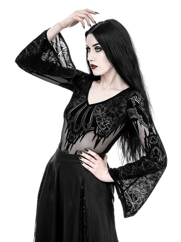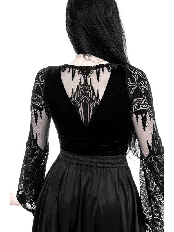 Body/Top met origineel kathedraalontwerp. Flock gedrukt patroon. Prachtig contrast tussen subtiel, transparant mesh en zwart fluweel. Uitlopende heksenmouwen geïnspireerd op 19e-eeuwse mode. Stretch fluweel aan de achterkant voor comfort. Haak- en oogsluiting met 3 verstelbare maten.