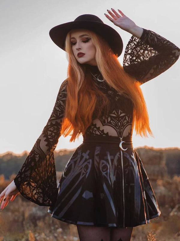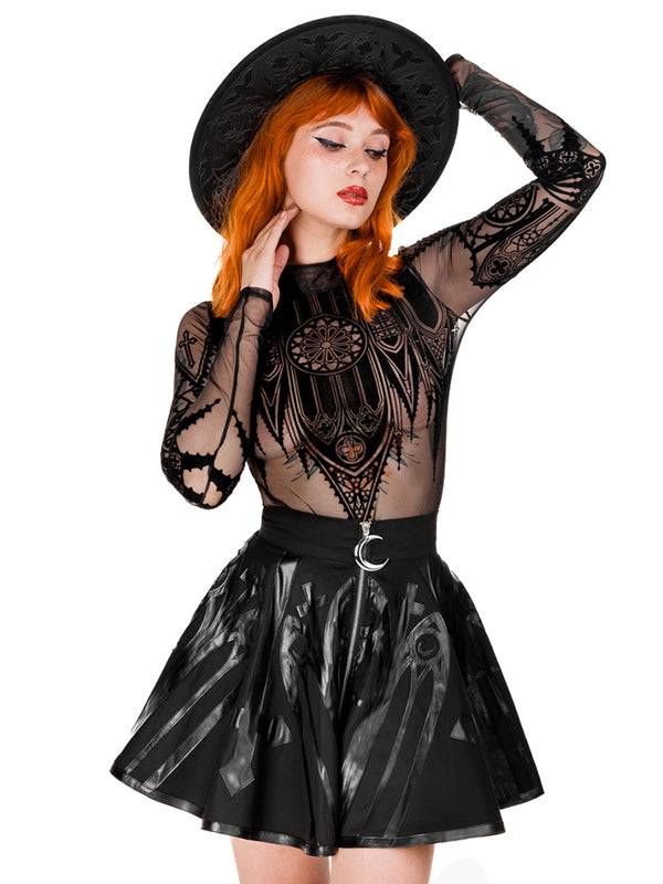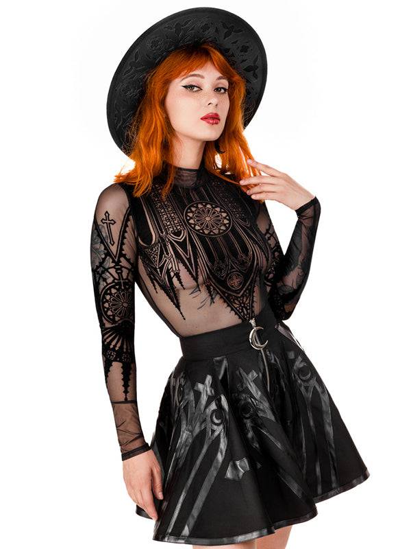 De minirok wordt gesloten met een metalen ritssluiting afgewerkt met een grote, decoratieve halve maan. Het unieke patroon verwijst naar gotische architectuur. Het toont een tekening van glas-in-loodramen die typerend zijn voor gotische kathedralen. De rok is geheel gemaakt van stevig katoen.