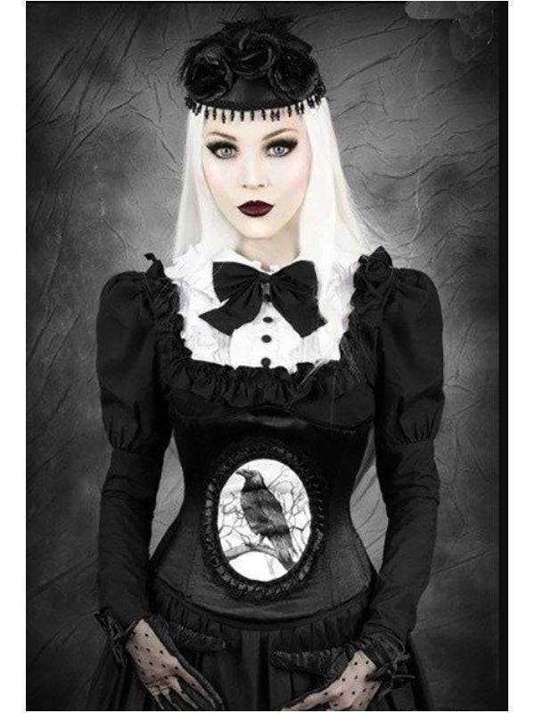 Gemaakt van zwart satijn. Zwarte katoenen voering. Underbust Korset met 20 spiraalvormige baleinen van metaal. Voorzijde versierd met kraaienprint. Het is omgeven door een ovaal frame gemaakt van satijnen lint en kant.