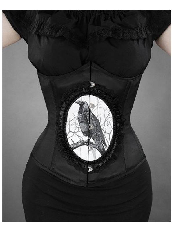 Black Satin Underbust Corset With Raven Print - 20 Spiral Boned Design
