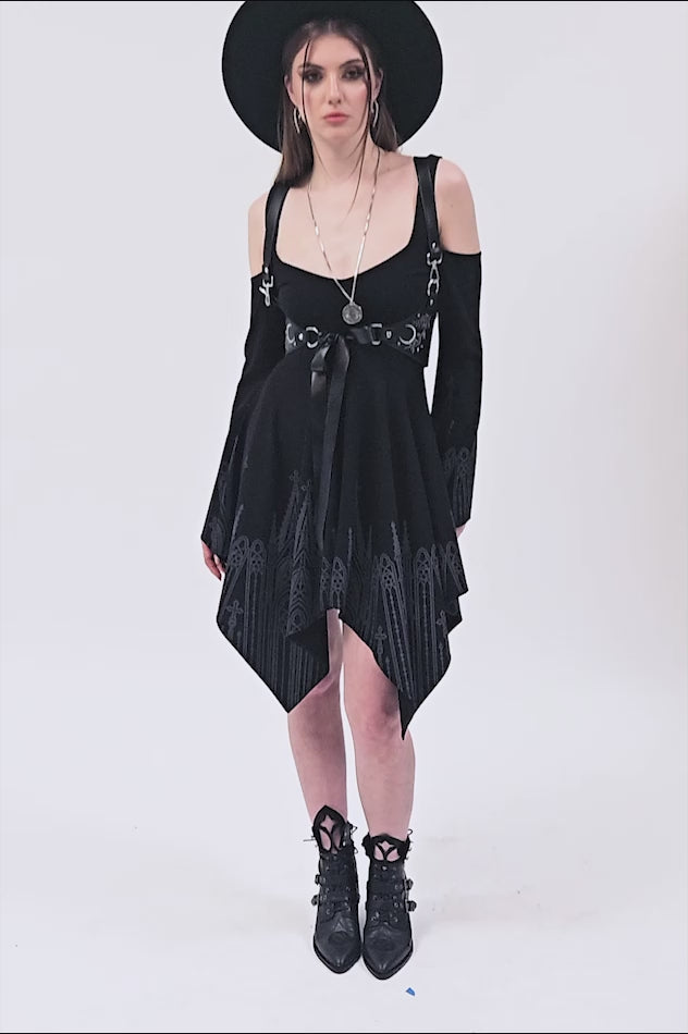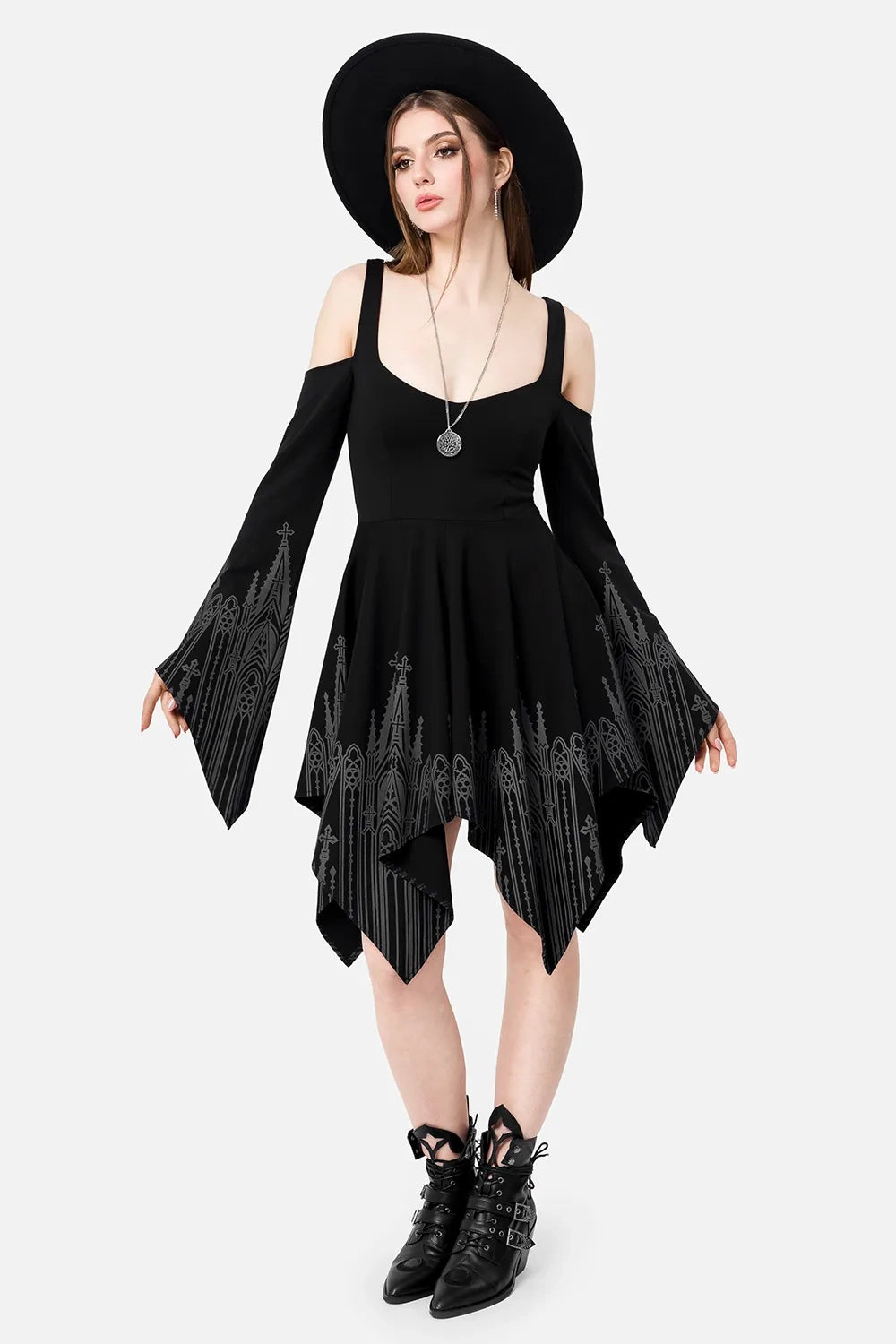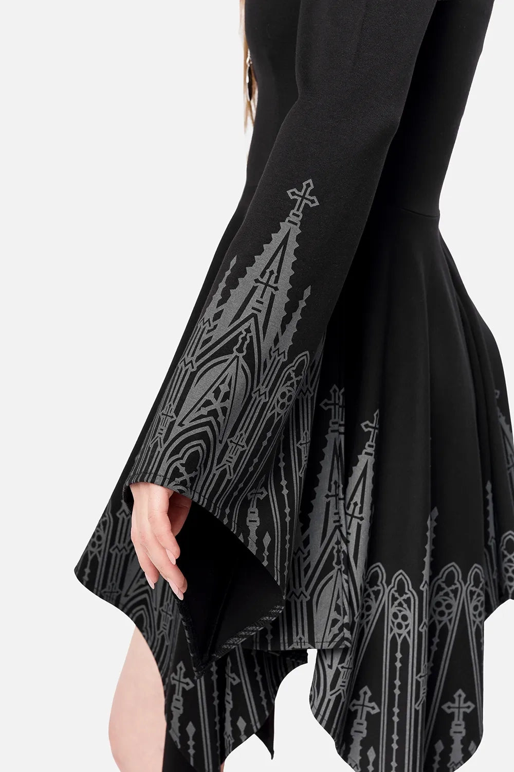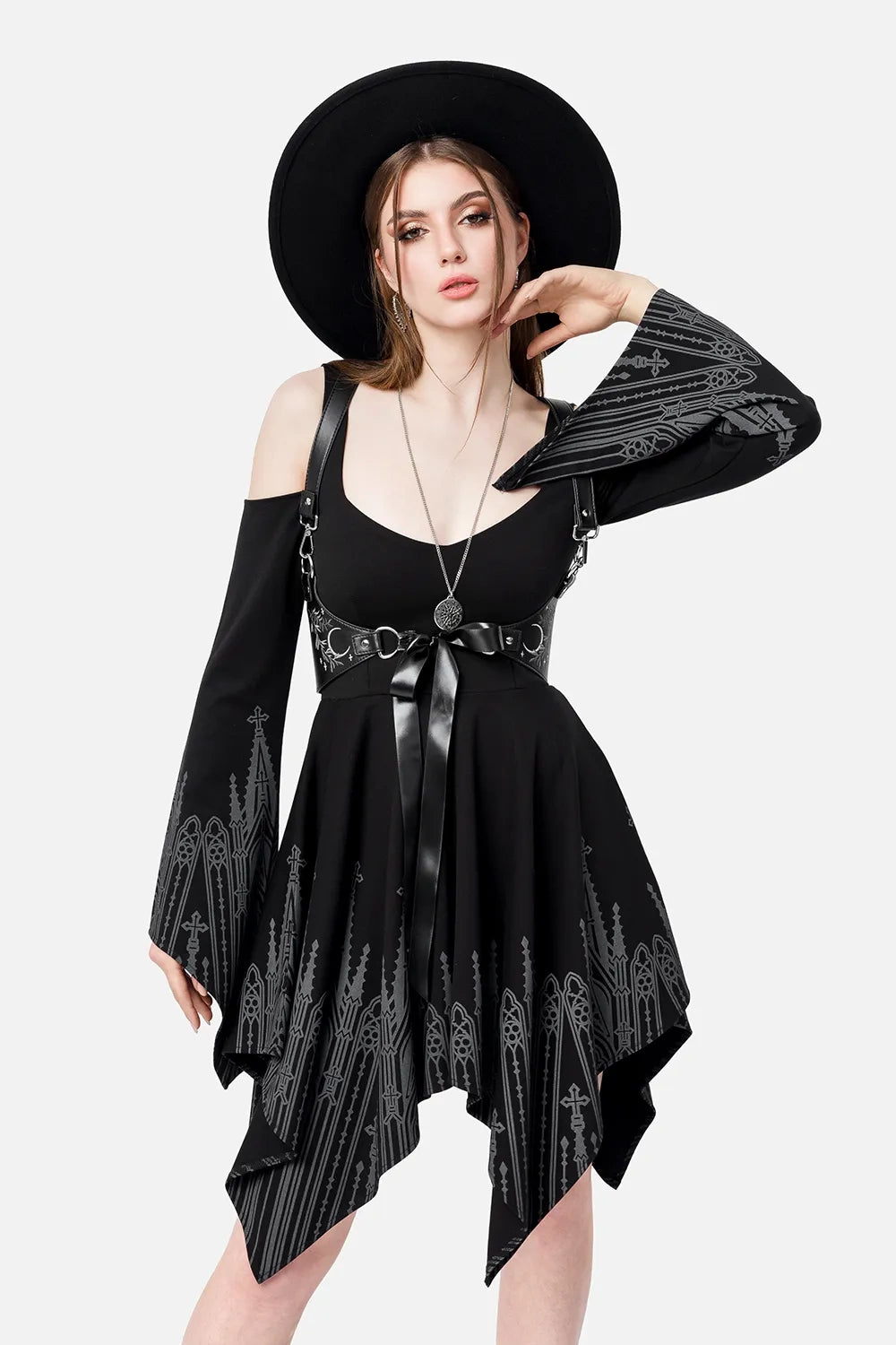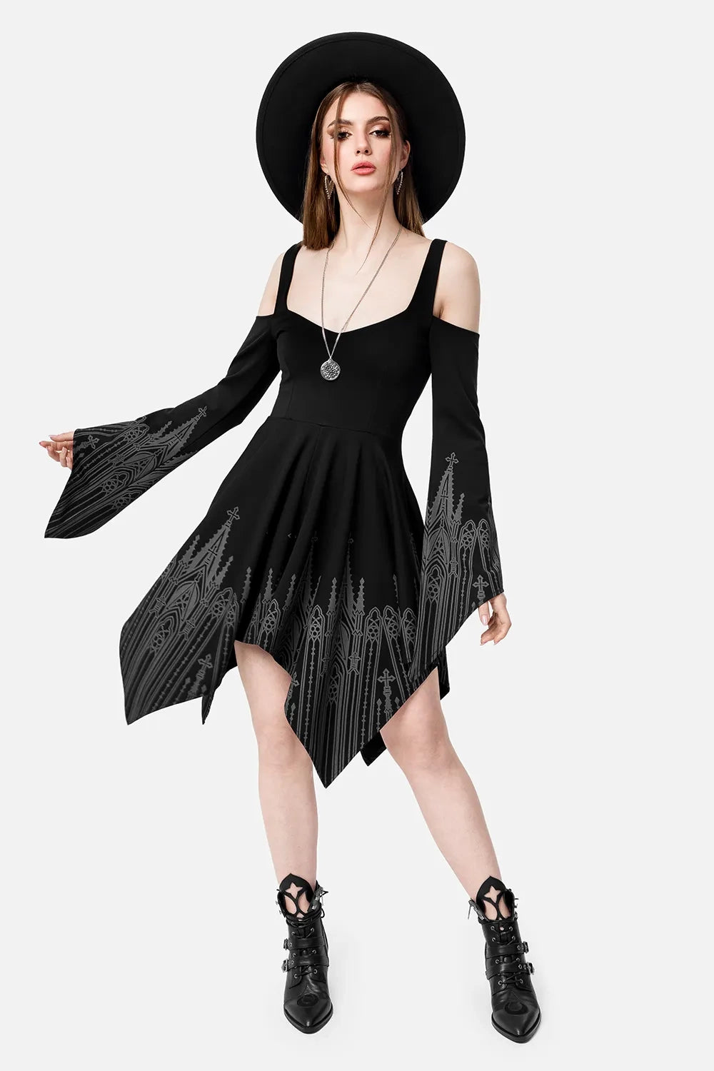 Gothic cold-shoulder dress made to stand out with dramatic shape and mystical charm. This mini dress with cathedral print captures bold gothic elegance in a flattering, modern silhouette. A perfect piece for fans of dark fashion, alternative clothing, and witchy aesthetics.