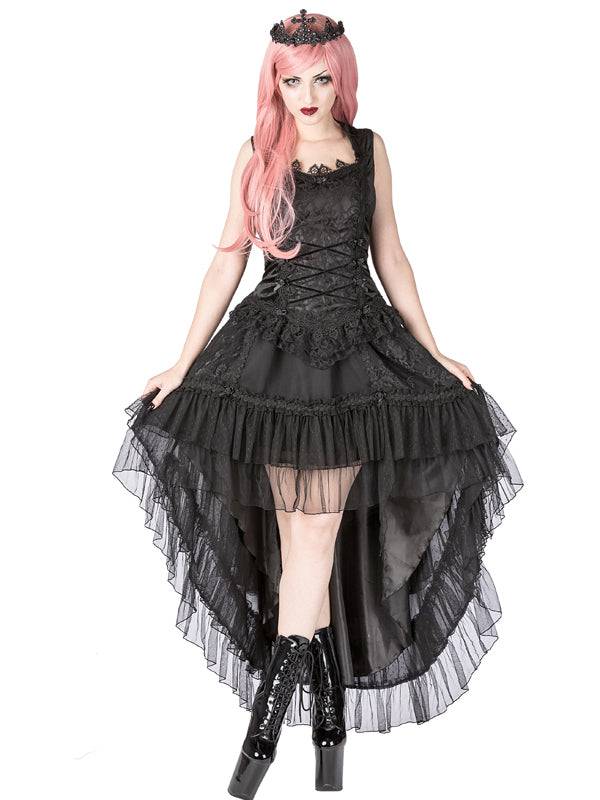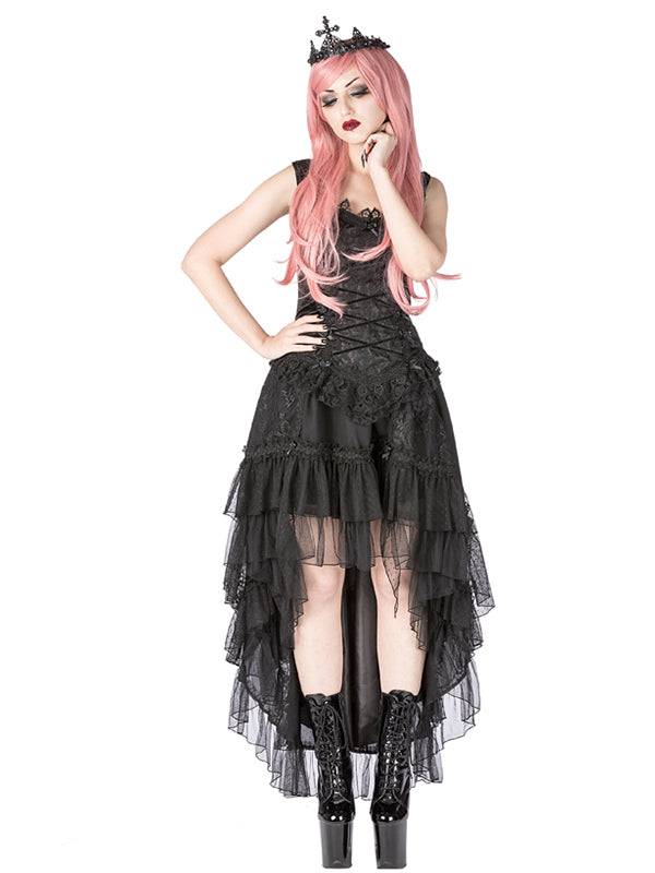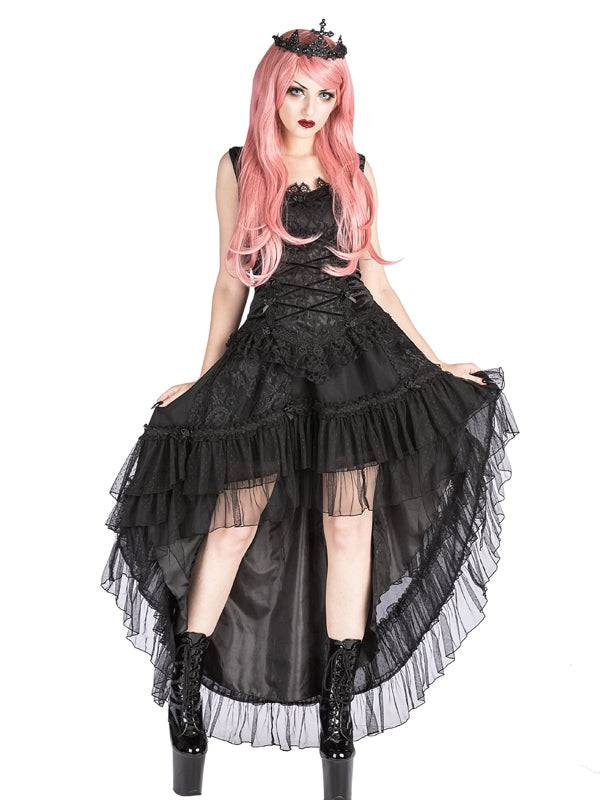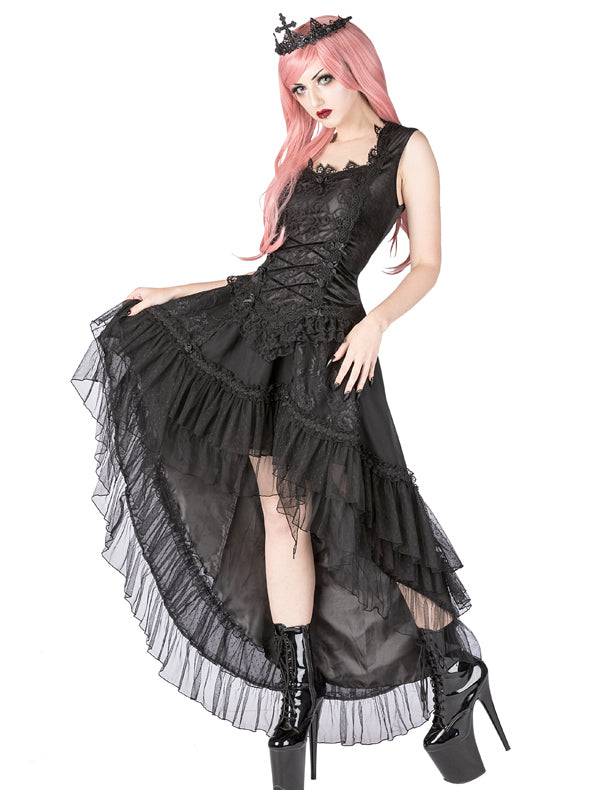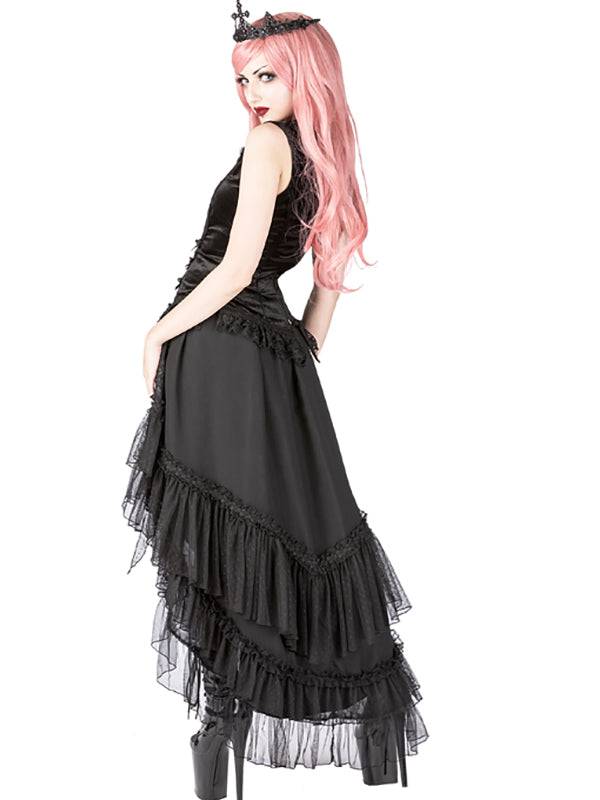 High low rok met een dubbele ruche van zachte mesh en een zachte zijdeachtige satijnen onderrok. De zijkanten van de zwarte chiffon rok zijn bedekt met Frans kant en afgezet met Venetiaans kanten lint. Elastische tailleband met onzichtbare ritssluiting aan de zijkant voor een perfecte pasvorm.