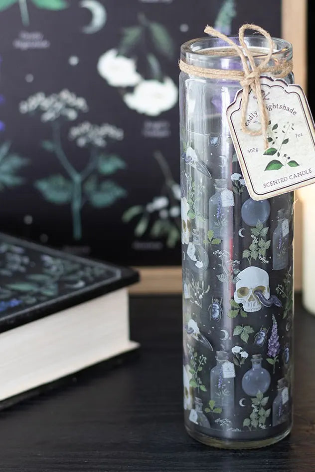 Bring a hauntingly beautiful glow to your space with this glass tube candle featuring a deadly nightshade design. Perfect for creating atmosphere, it s an excellent gift for those who adore unique and gothic inspired d cor. Approximate 70 hour burn time.