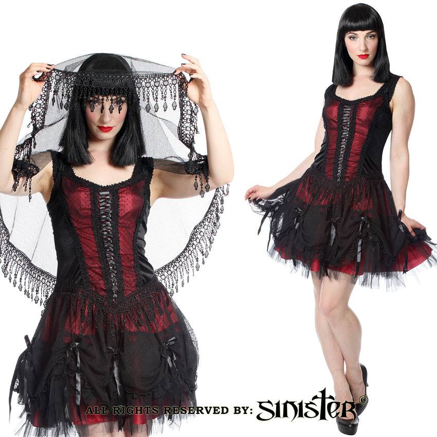 Sinister. Fluwelen mouwloze mini-jurk. Rok gemaakt van satijn en tule versierd met satijnen strikken, rozen en een ruche. Ritssluiting middenachter.