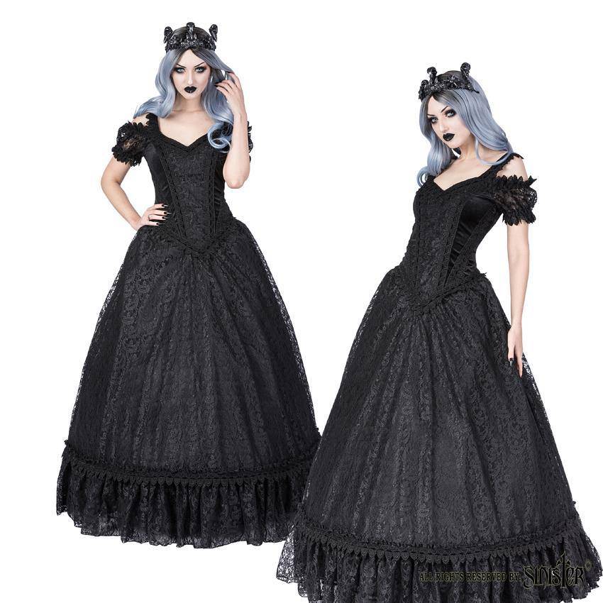 Sinister. Lange jurk met een diamanten halslijn en elastische pofmouwen van Frans kant. De rok is geheel gevoerd met zijdezacht satijn. Ritssluiting middenachter.