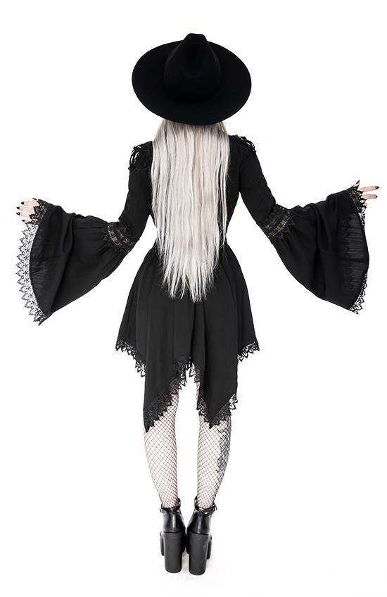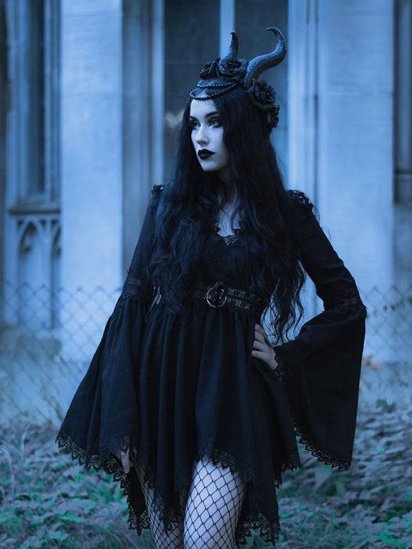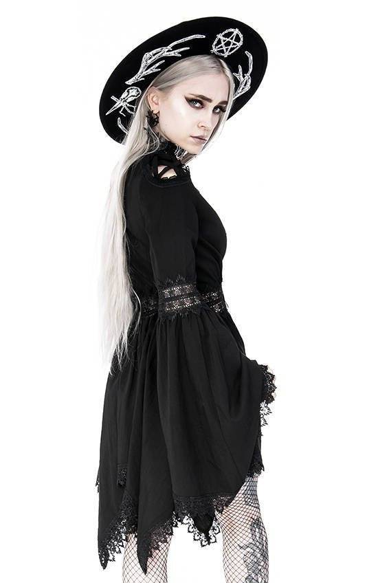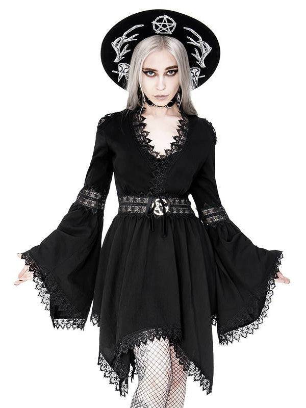Spectre Dress L with Deep V-Neck, Guipure Trims & Unique Pentagram Insert